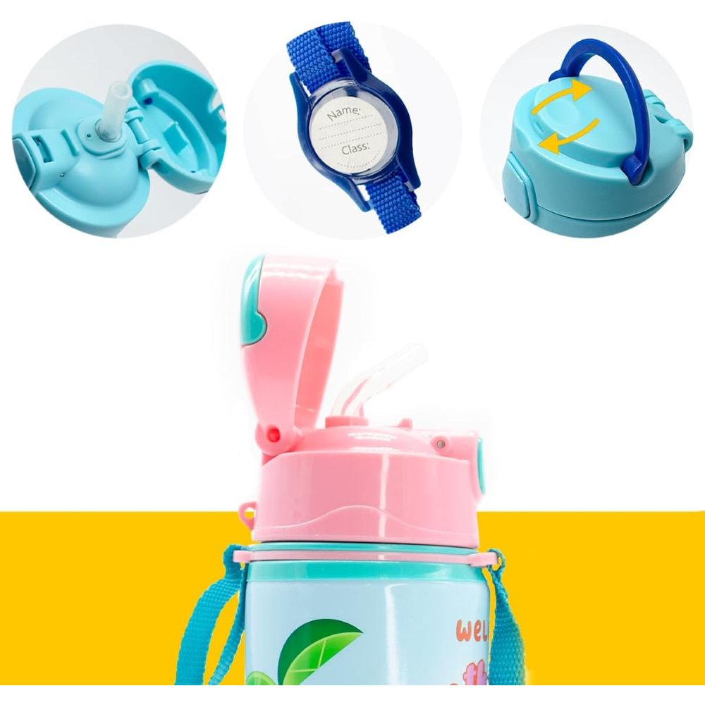 Benefícios: 💧 Hidratação ao Longo do Dia: Permite transportar água ou outras bebidas durante atividades escolares ou momentos ao ar livre. 🖐️ Utilização Simples: O sistema com botão de abertura e palhinha facilita que a criança beba de forma prática. 🎒 Transporte Confortável: A alça ajustável permite transportar o cantil facilmente em passeios ou atividades.