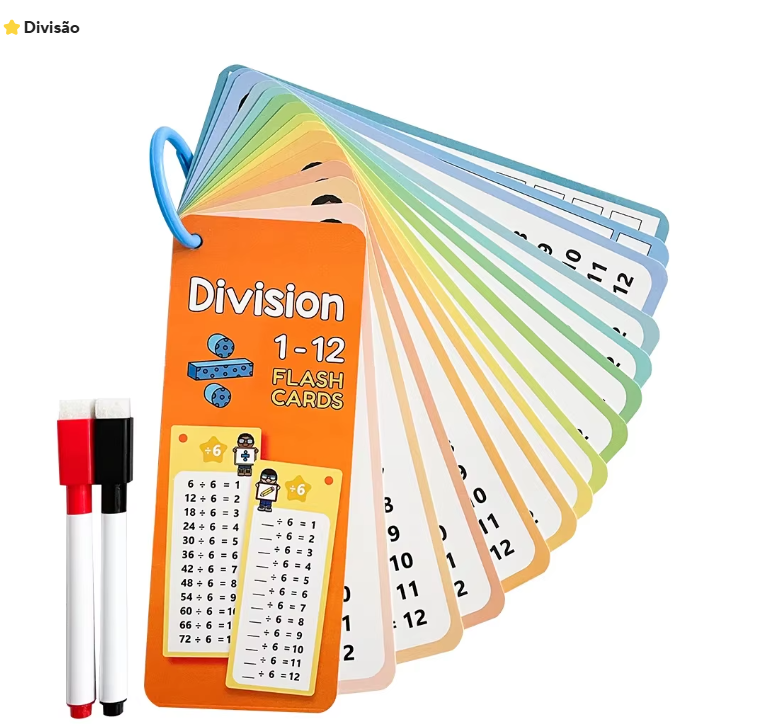 ✔️ 30 cartões reutilizáveis: 15 de multiplicação e 15 de divisão.