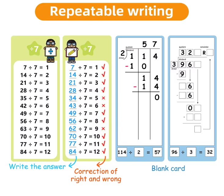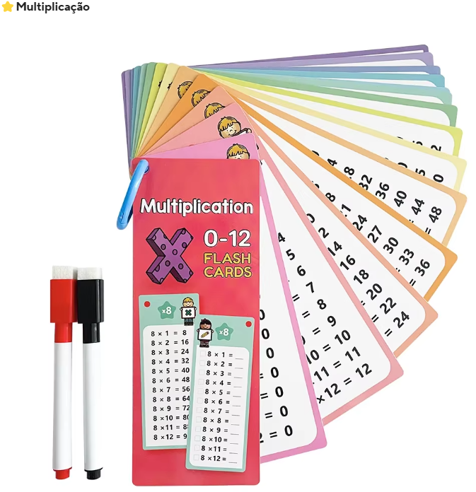 Transforma a aprendizagem da matemática numa experiência interativa e estimulante! Este conjunto inclui 30 cartões reutilizáveis, sendo 15 de multiplicação e 15 de divisão, com exercícios progressivos para praticar operações matemáticas de forma autónoma. Acompanha 2 marcadores pretos e 2 vermelhos, ambos com apagador na ponta, permitindo corrigir e repetir os cálculos sempre que necessário. Uma ferramenta essencial para desenvolver a confiança e a destreza no cálculo mental!