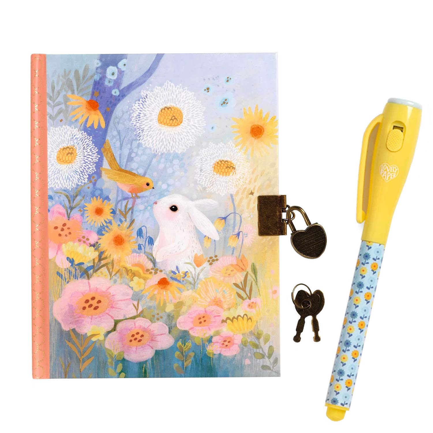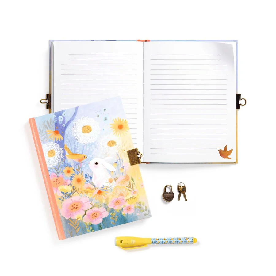 Um mundo de imaginação e criatividade, com um toque de privacidade e segurança. Este diário encantador é perfeito para crianças que adoram guardar os seus segredos e memórias num espaço só seu. Ilustrado pela talentosa artista Kendra Binney, apresenta uma delicada cena de um coelho branco e um pássaro num prado em tons pastel. Cada página pautada torna-se um refúgio para pensamentos, sonhos e aventuras.