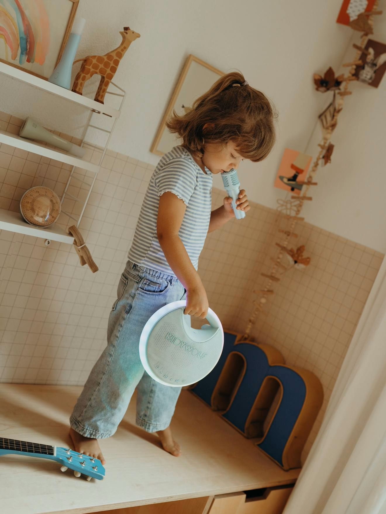✋ Coordenação motora: Manipular microfones e botões aprimora a motricidade fina.