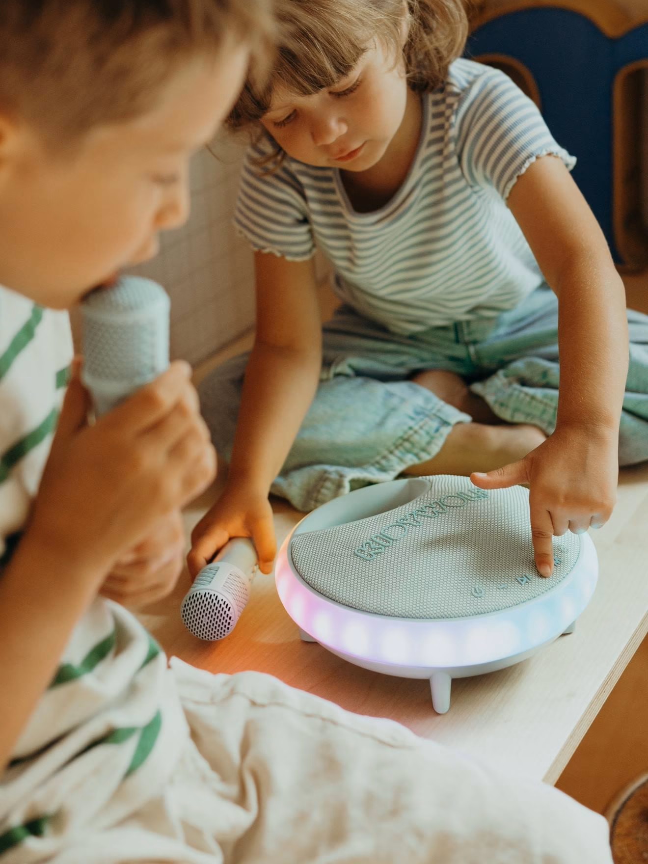 O KIDYKARAOKE transforma qualquer espaço num palco de diversão! Com dois microfones sem fios, efeitos de iluminação e um potente altifalante de 40W, é perfeito para cantar em casa, ao ar livre ou em viagem — garantindo momentos mágicos de música, alegria e partilha.