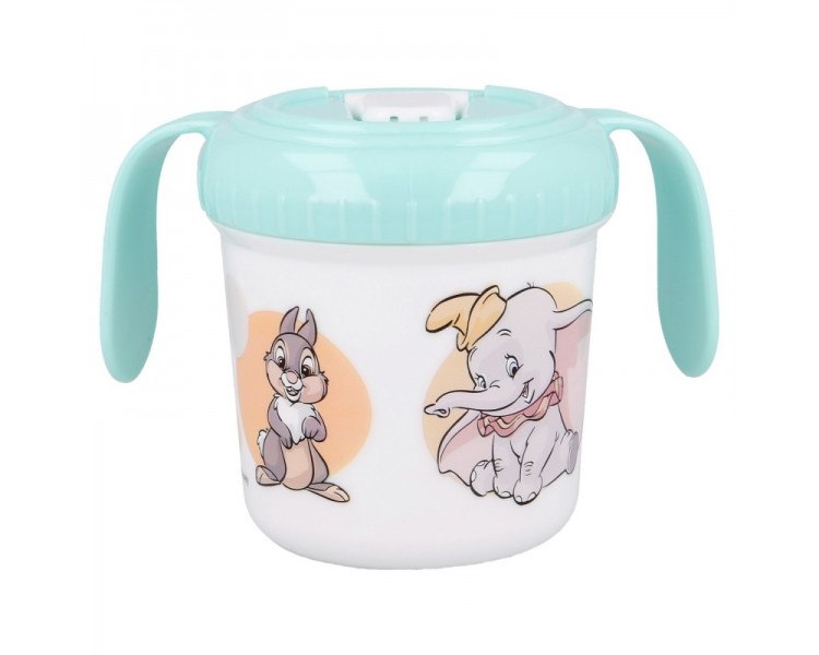 Copo educativo especial com bico para bebés, ideal para que os mais pequenos aprendam a beber num copo convencional. As crianças vão adorar o design original de personagens clássicas da Disney, enquanto desfrutam da sua água ou sumo. Com capacidade para 250ml, é feito de material plástico livre de BPA e possui um bico dobrável para evitar derramamentos e alças projetadas especialmente para as mãozinhas pequenas.