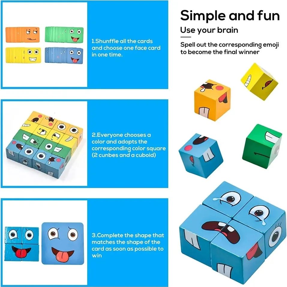 Este jogo educativo permite que as crianças reconheçam e expressem emoções de forma criativa e envolvente. Ao montar carinhas com blocos coloridos e imitar as expressões representadas, os mais pequenos desenvolvem competências emocionais, cognitivas e sociais, enquanto brincam e aprendem.