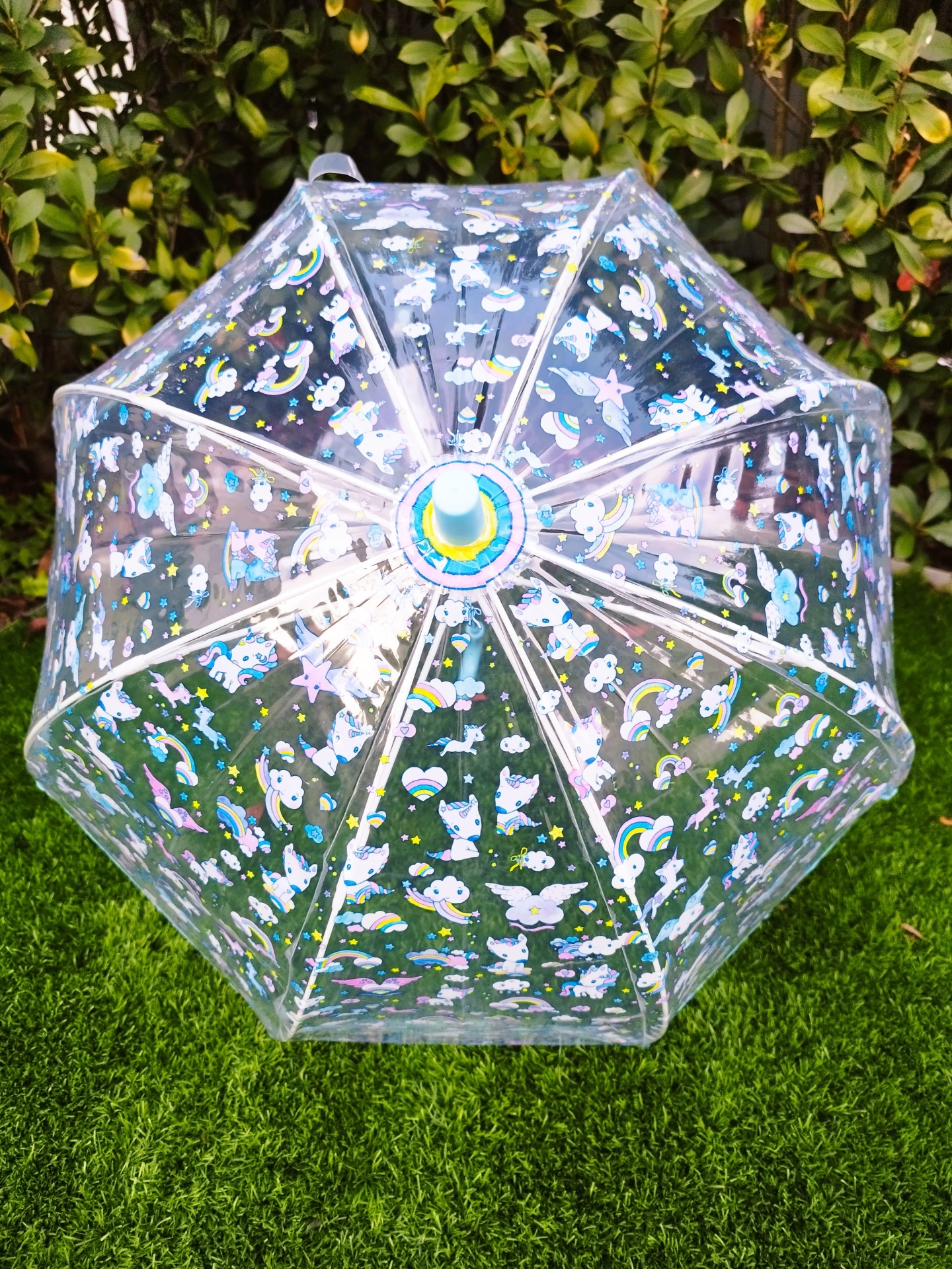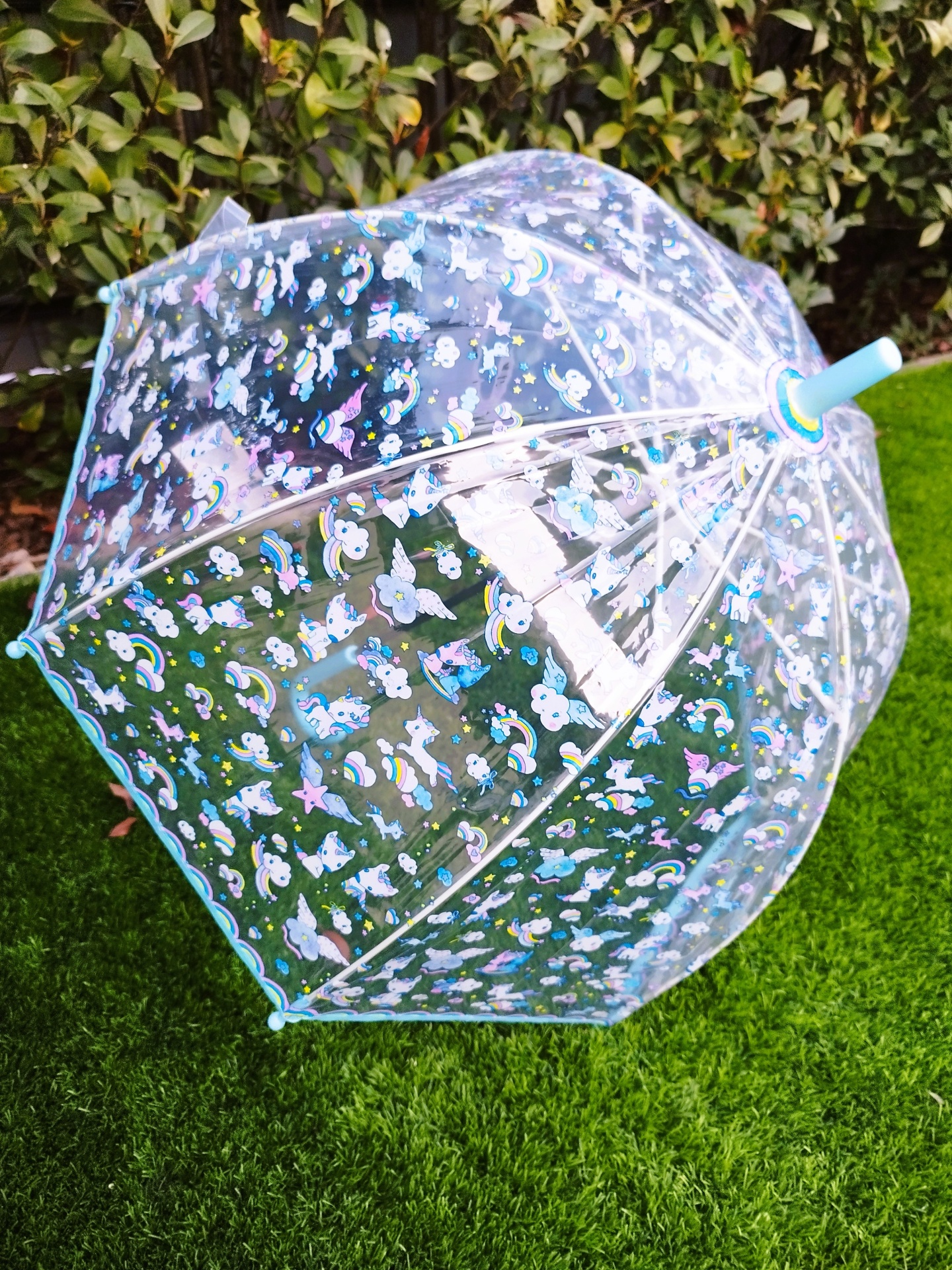 O Guarda-Chuva Unicórnios da Djeco combina estilo e segurança para proteger os pequenos nos dias de chuva. Com design transparente, permite que a criança veja para onde vai, proporcionando uma experiência segura e divertida. O sistema de abertura manual possui proteção especial para evitar entalar os dedos, garantindo facilidade no uso.