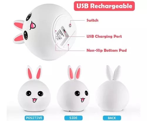 ✅ Inclui: 1 Luz Noturna em formato de Coelho, 1 Cabo USB para carregamento e 1 Manual de instruções.
