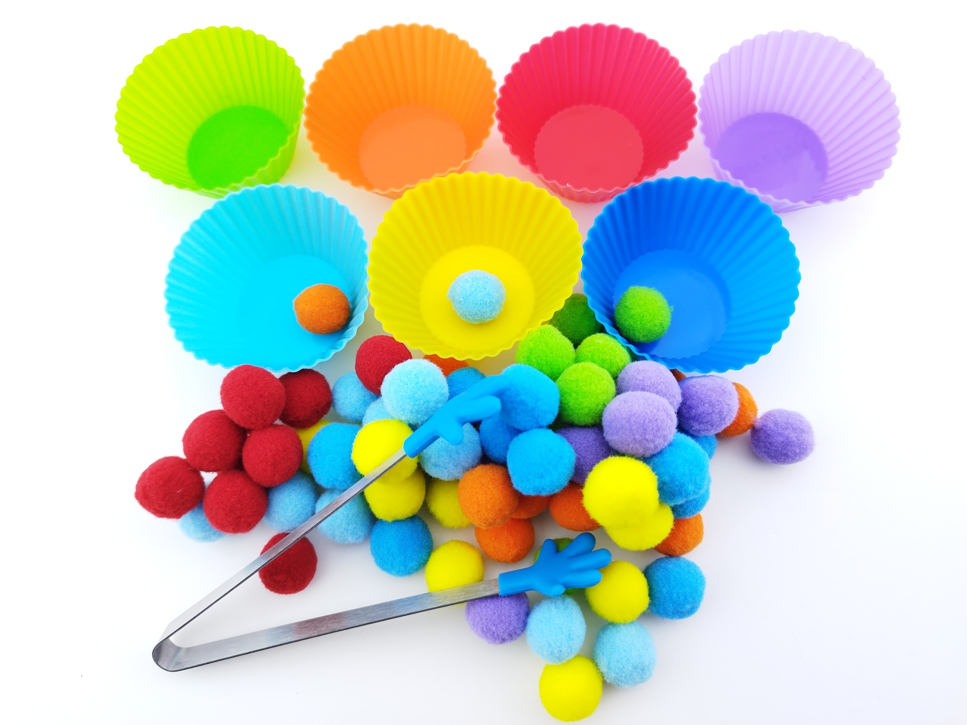 ✅ 1 Jogo de pinça com 70 pompons (Ø1.8 cm), 7 formas (Ø7x3 cm) e 1 pinça (14x2.5 cm)
