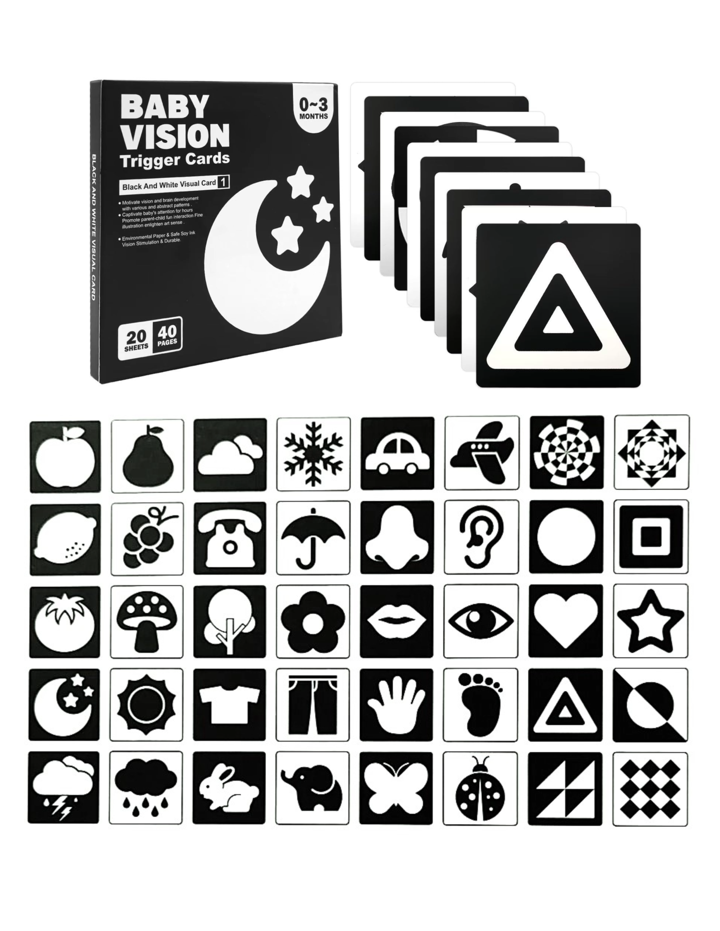 ✅ 20 Cartões lógicos com contraste preto e branco (40 faces) (14x14 cm)