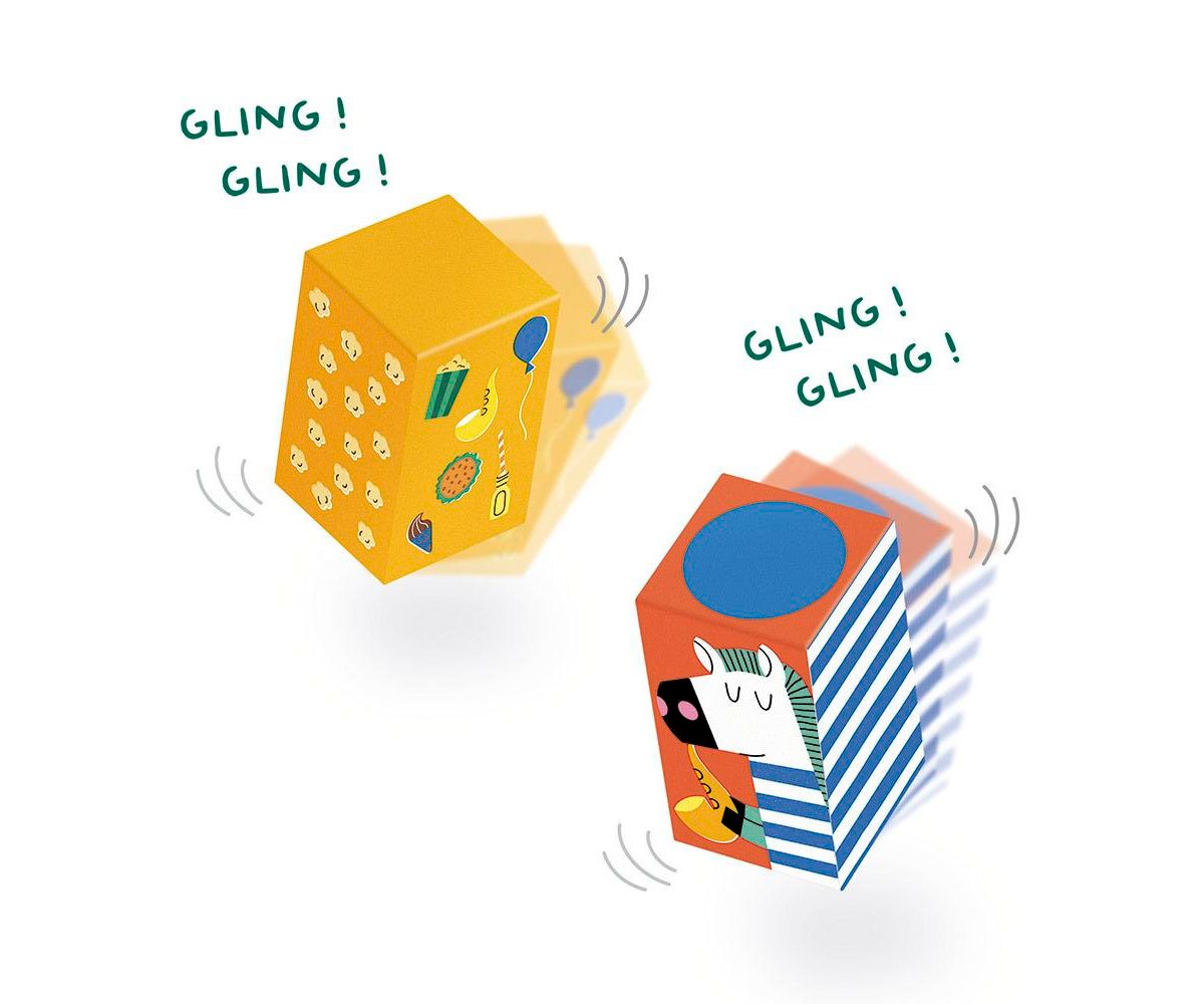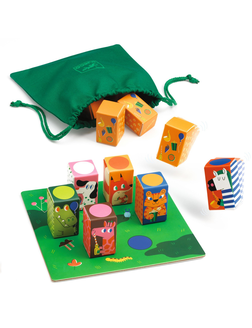 ✔️ Inclui 12 cubos sonoros, 1 tabuleiro e 1 saco de tecido.
