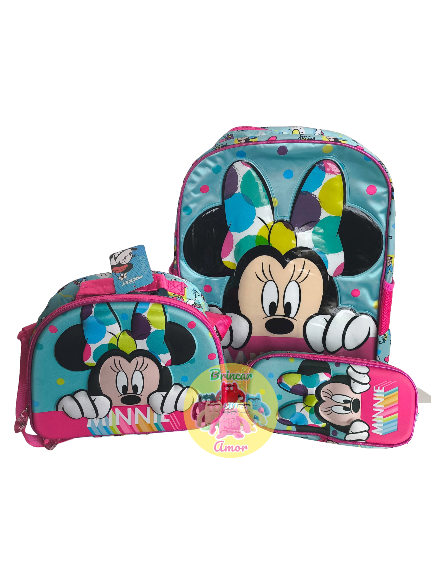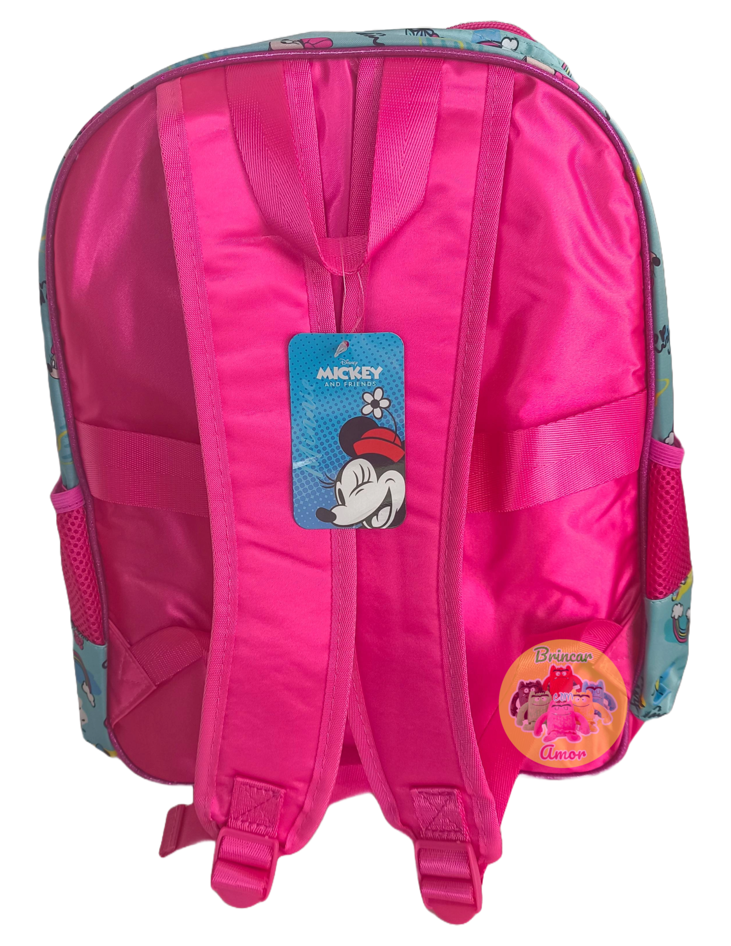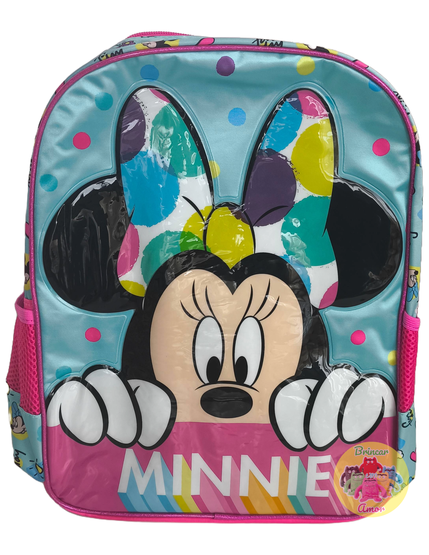 Características: - Design temático da Minnie com relevo - Compartimento único espaçoso com forro - Dois bolsos laterais em rede - Alças acolchoadas e ajustáveis - Faixa traseira para carrinho tipo trolley - Pega de mão resistente - Material: Poliéster de alta qualidade