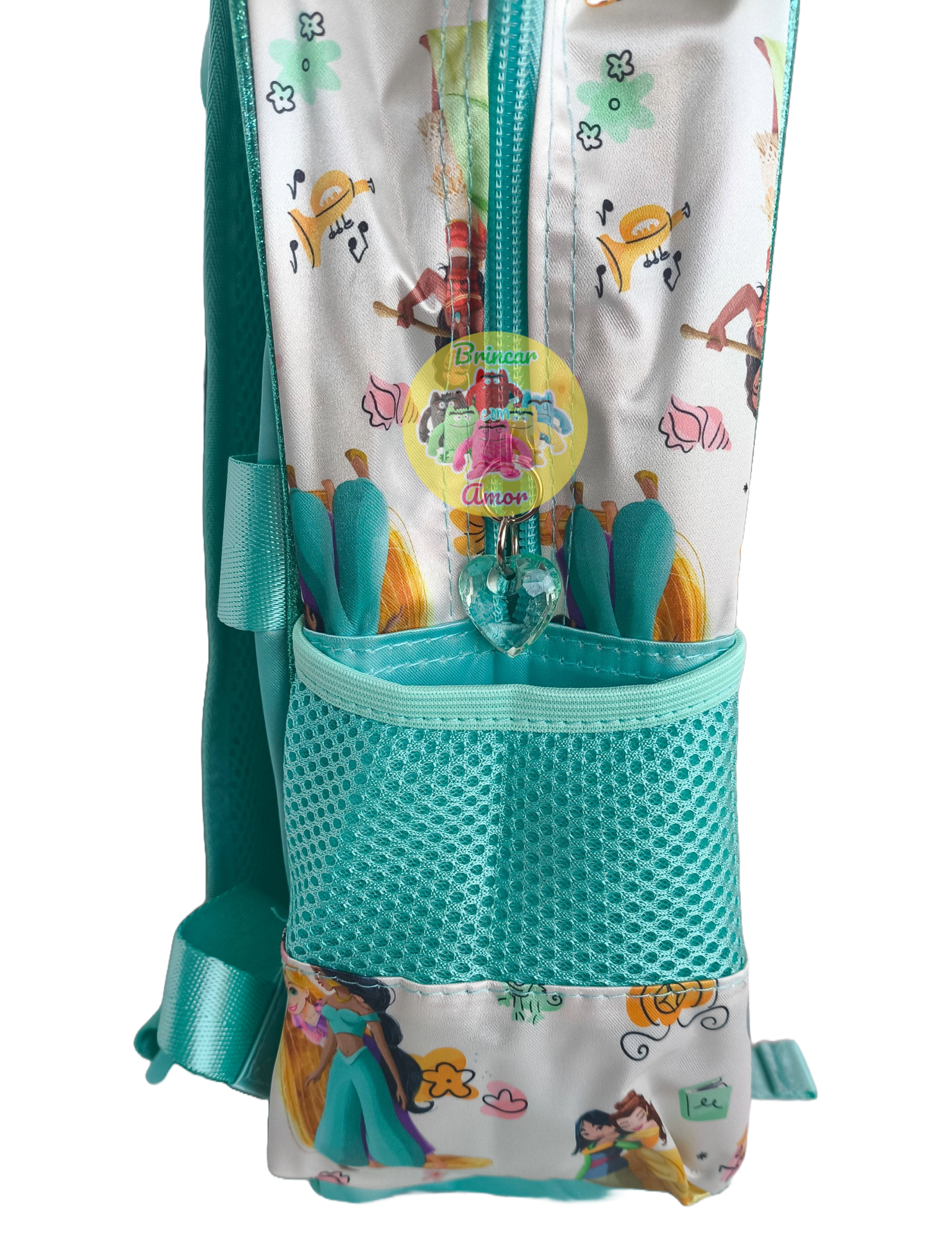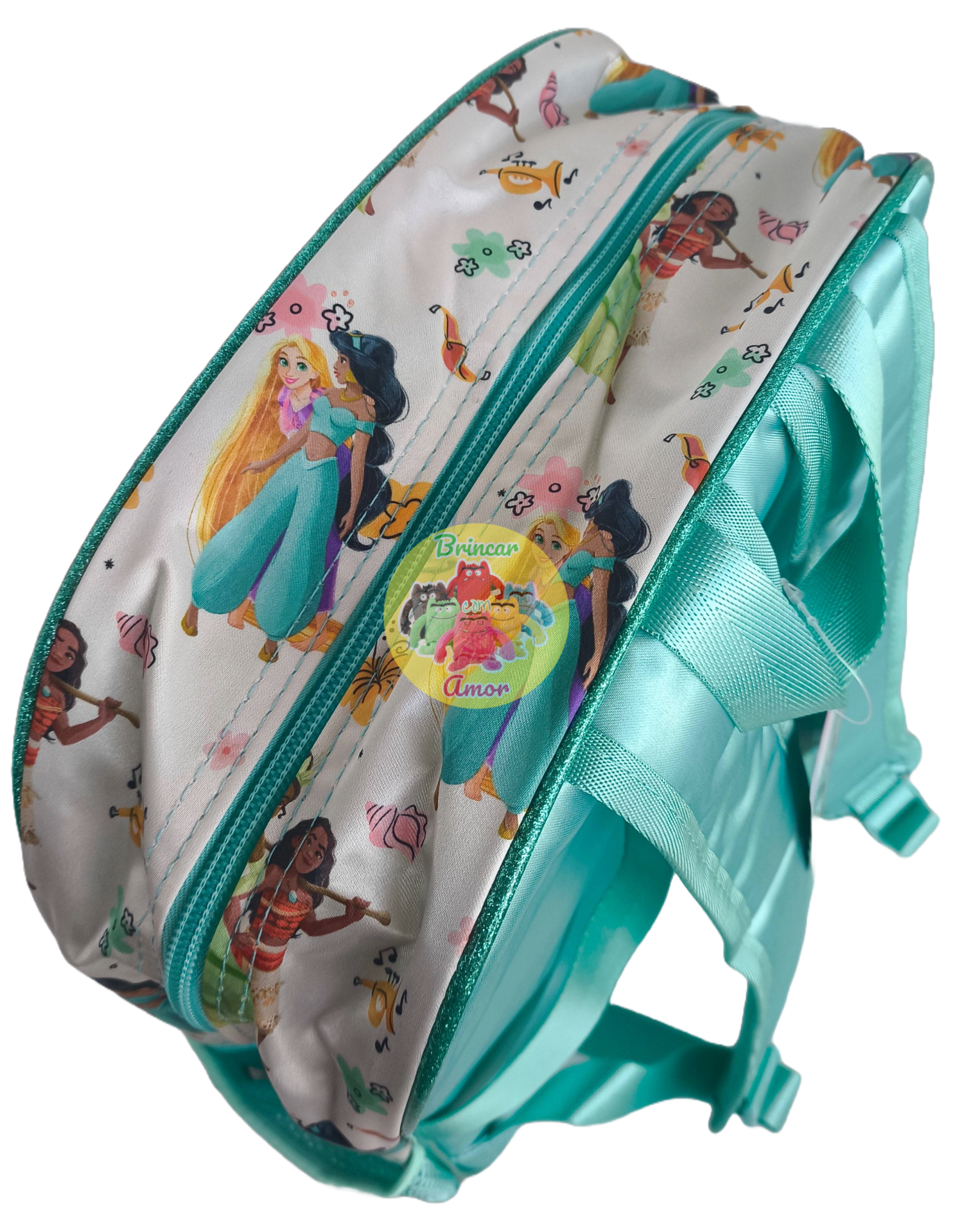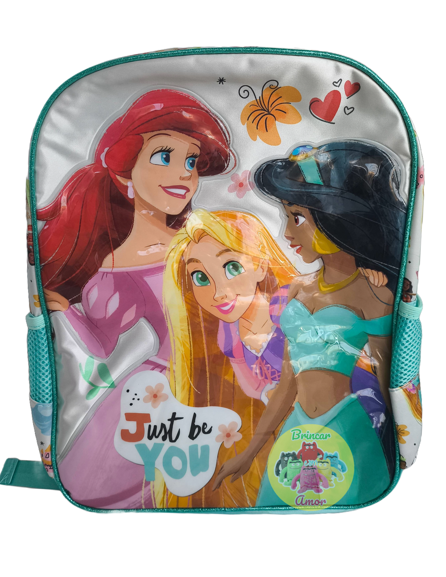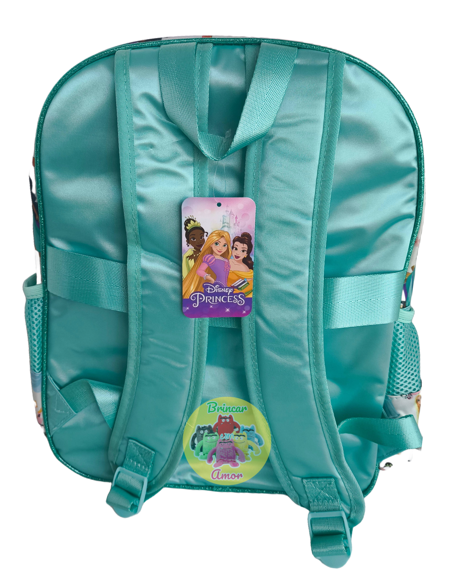 Características: - Design temático das Princesas Disney com relevo - Compartimento único espaçoso com forro - Dois bolsos laterais em rede - Alças acolchoadas e ajustáveis - Faixa traseira para carrinho tipo trolley - Pega de mão resistente - Material: Poliéster de alta qualidade