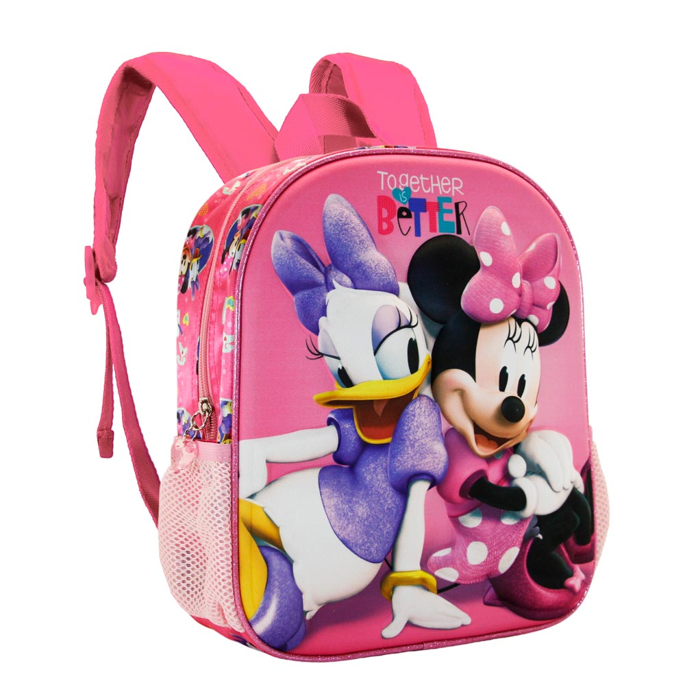 Apresentamos a nossa mochila infantil 3D das adoráveis Minnie e Margarida, ideal para crianças em idade de creche e pré-escolar. Esta mochila destaca-se pelo seu relevo frontal 3D, que não só adiciona um toque divertido e visualmente apelativo, mas também torna a mochila única e especial para os mais pequenos. Com um compartimento principal espaçoso e equipado com fecho e forro interno, esta mochila oferece espaço suficiente para armazenar lanches, brinquedos e outros essenciais diários. Além disso, possui dois bolsos laterais em malha, perfeitos para guardar garrafas de água ou pequenos itens de fácil acesso. Com esta mochila, as crianças estarão sempre preparadas para a aventura diária, levando consigo um acessório prático e cheio de estilo.