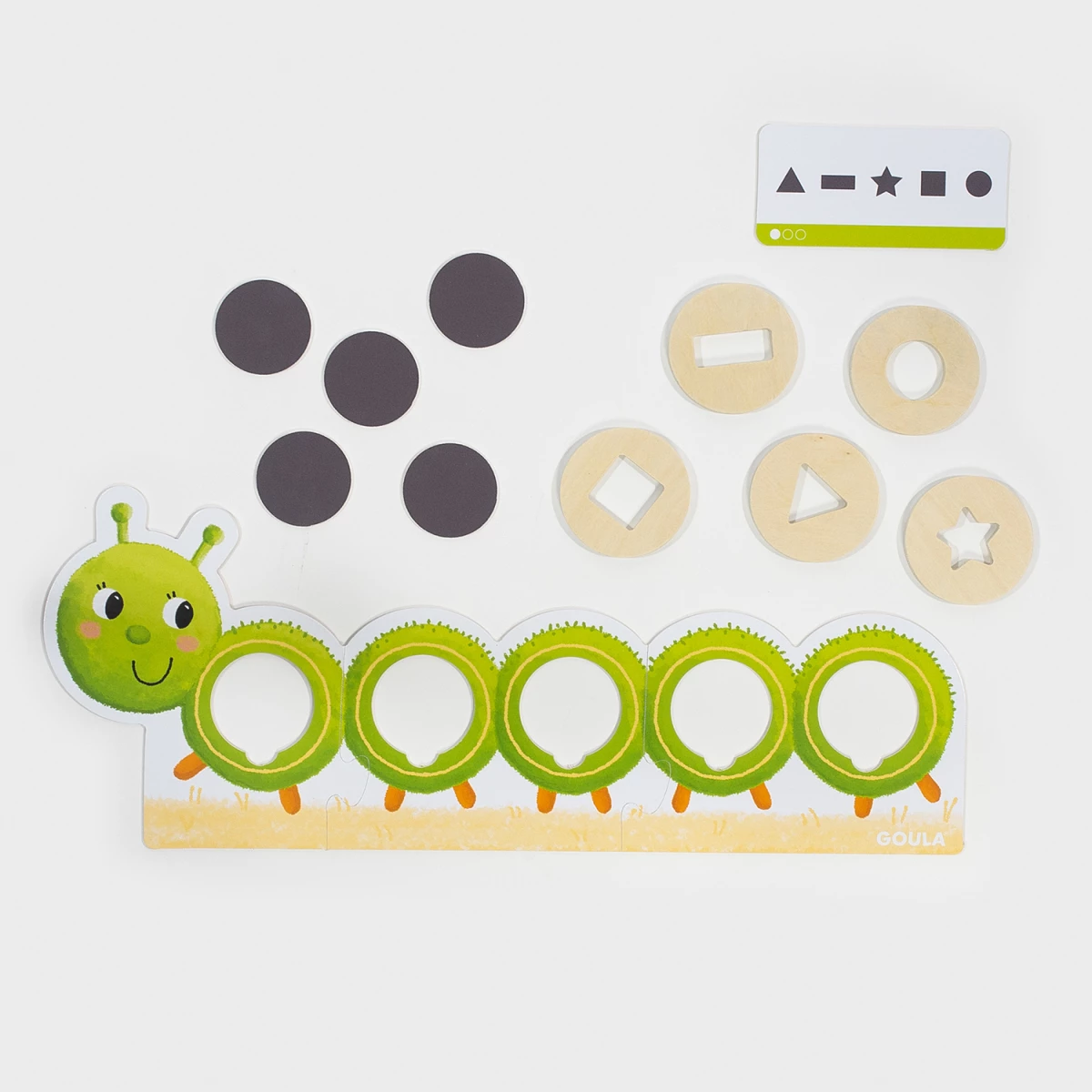 ✅ Conteúdo do set: lagarta-puzzle, 5 fichas coloridas, 5 peças de madeira e 20 cartas.