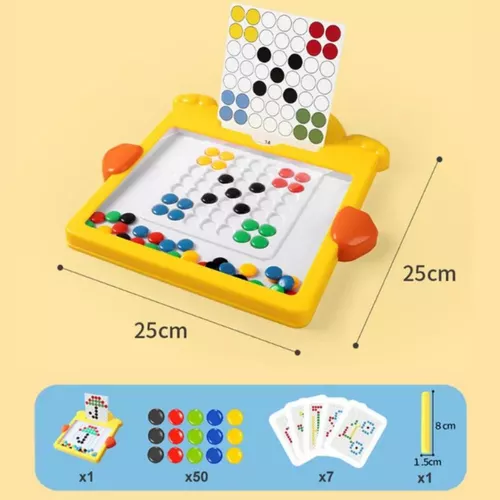 Benefícios Educativos: 🎨 Expressão Criativa: Permite desenhar livremente e explorar padrões com os cartões incluídos. 🤲 Motricidade Fina: Manipular as contas magnéticas melhora o controlo manual e a coordenação mão-olho. 🧠 Desenvolvimento Cognitivo: Estimula a lógica visual, a resolução de problemas e o pensamento espacial.