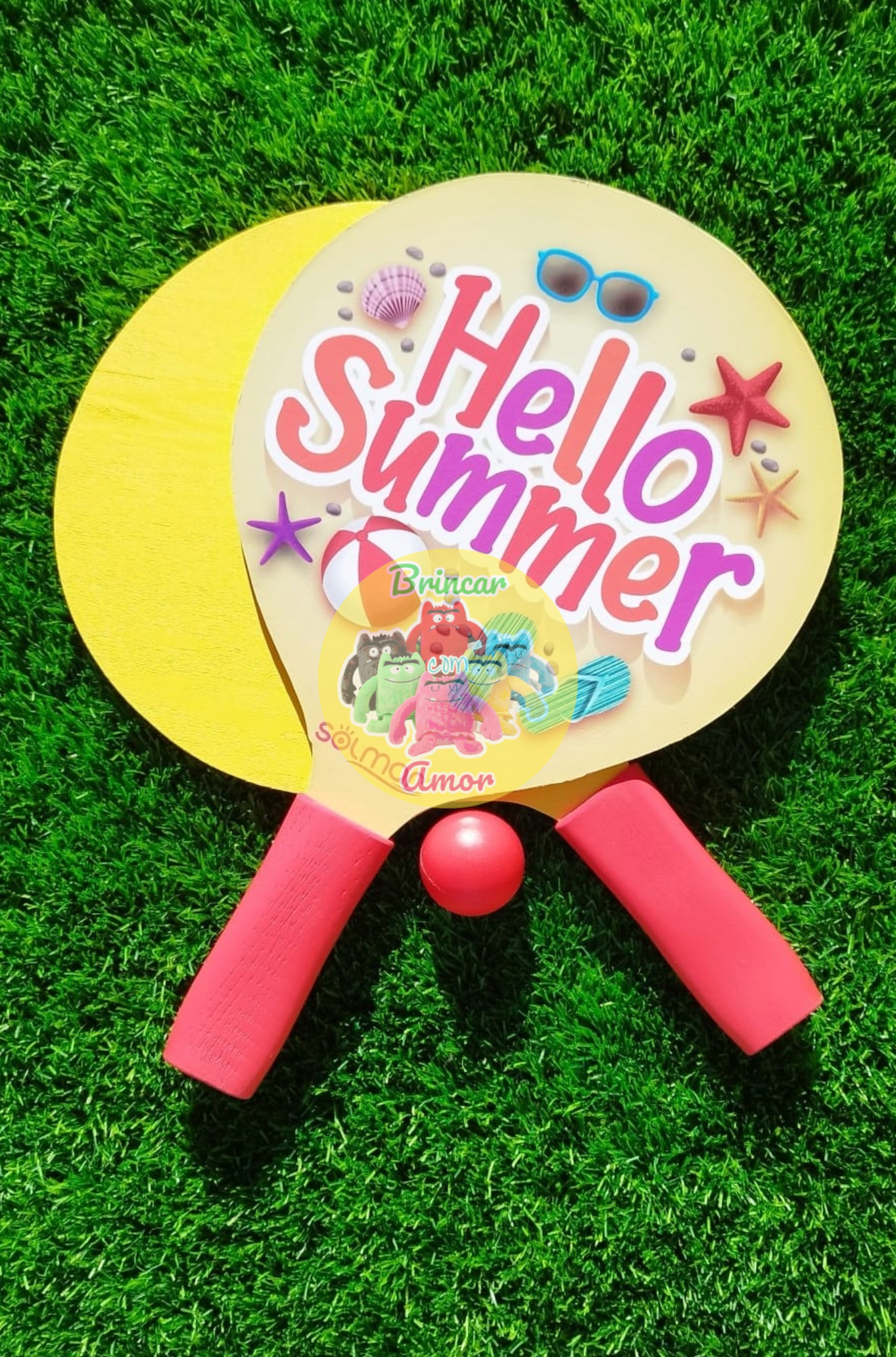 ✅ Estampagem “Hello Summer” vibrante e divertida nas raquetes.