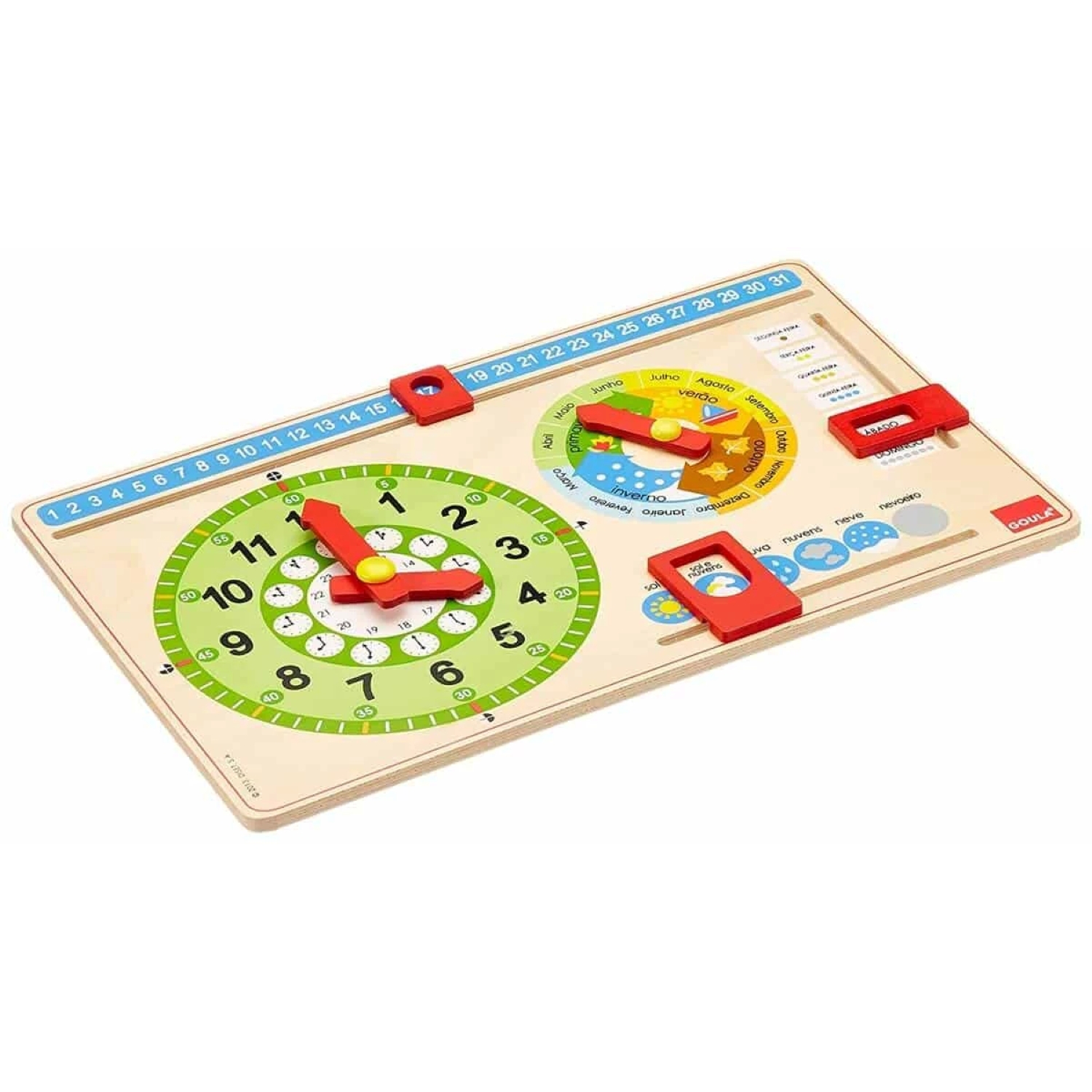 O Relógio e Calendário Infantil da Goula é uma ferramenta educativa completa, ideal para ajudar a criança a compreender o tempo de forma visual e envolvente. Com todas as informações em português e um design em madeira resistente, permite explorar meses, estações, dias da semana, clima, horas e minutos de forma intuitiva.