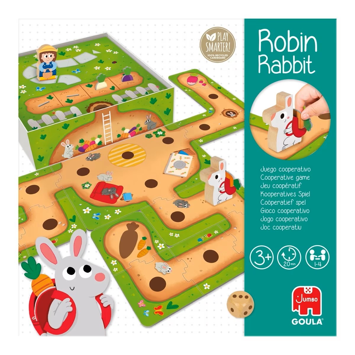 Prepara-te para uma aventura cheia de cooperação e diversão com o Robin Rabbit da Goula! Neste jogo de tabuleiro encantador, as crianças ajudam o coelhinho a construir a sua toca e a recolher legumes antes que o agricultor o encontre. Cada partida é única, com caminhos que podem ser montados de várias formas, oferecendo sempre uma nova história para viver em conjunto.