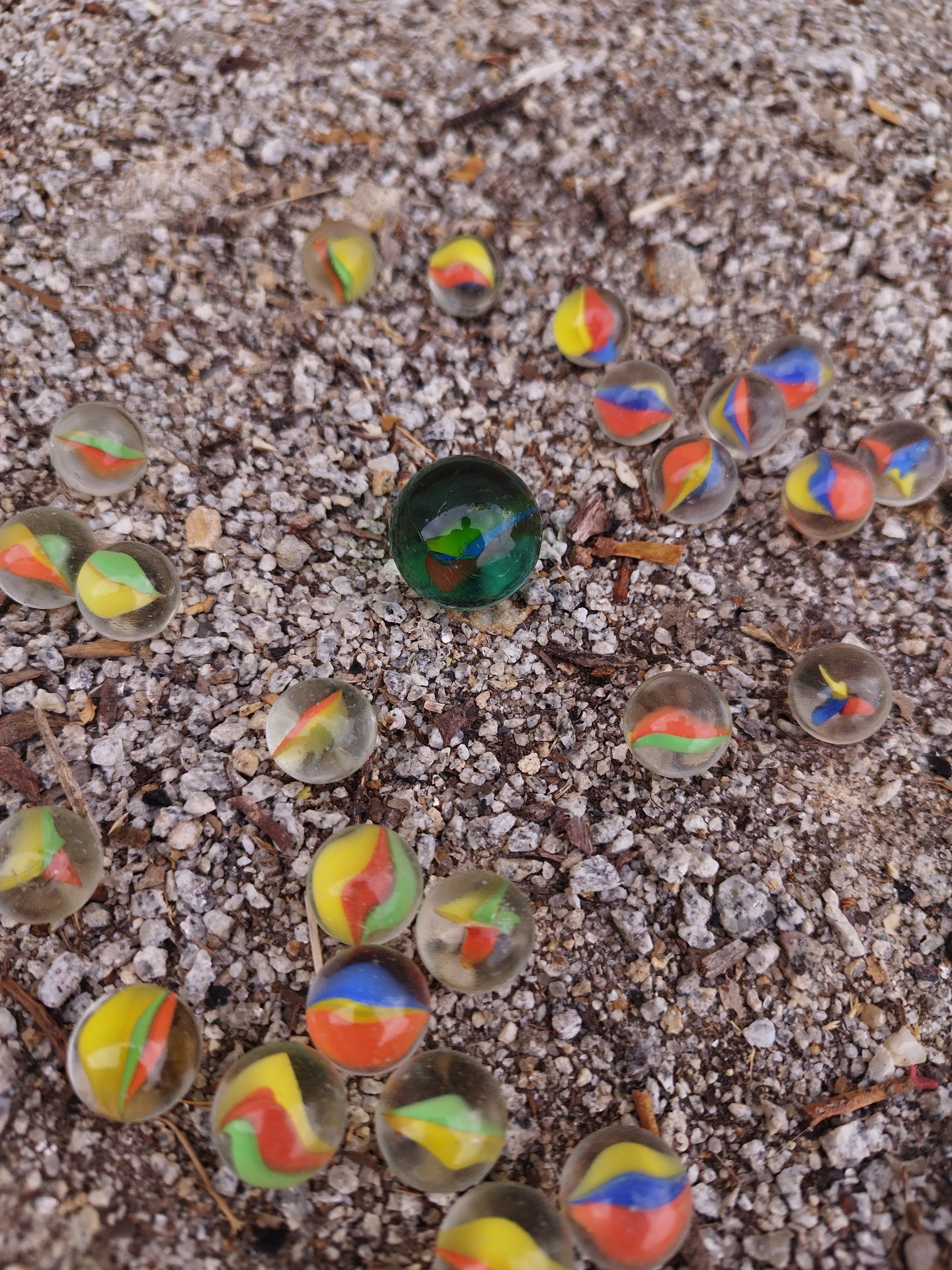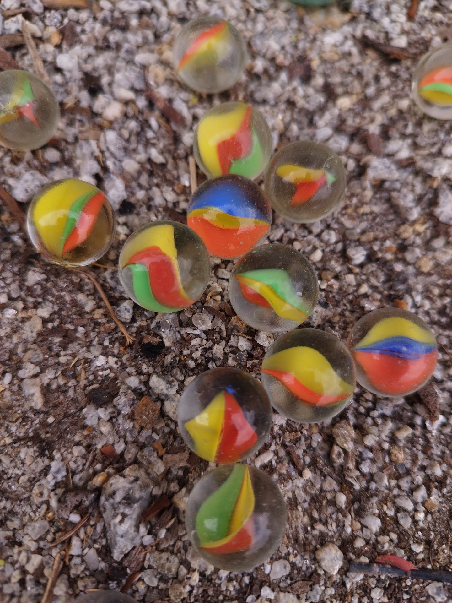 ✅ Conjunto com 51 berlindes de vidro: 50 pequenos e 1 grande.