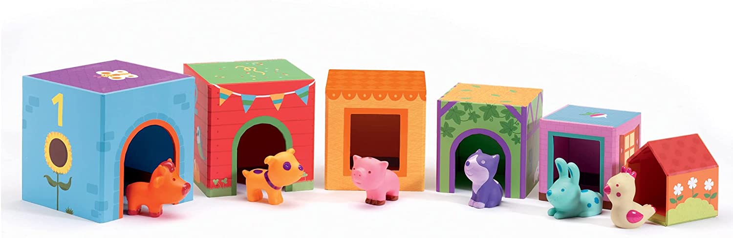 ✅ Conteúdo: 6 cubos de cartão numerados com ilustrações; 6 animais de borracha coloridos.