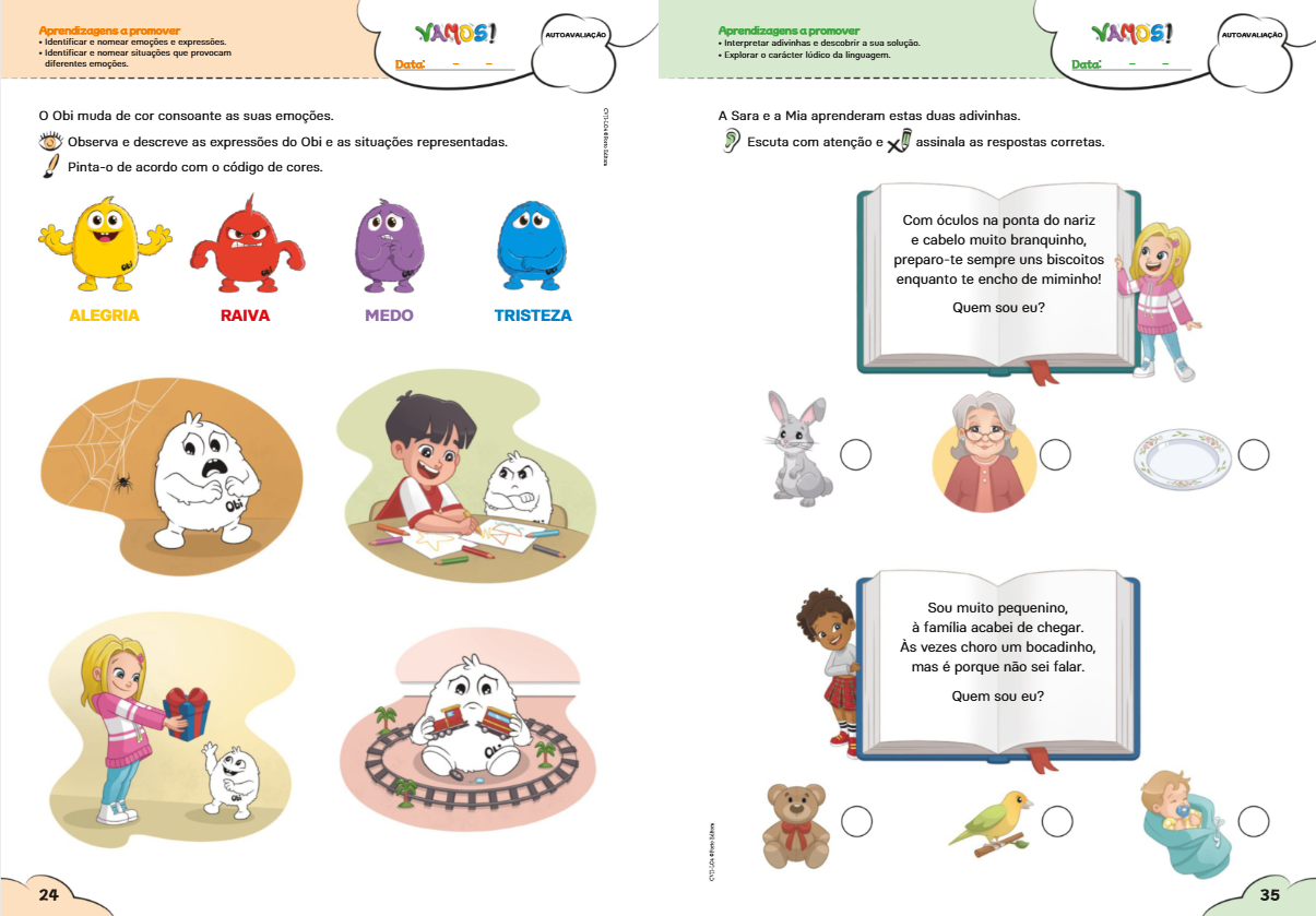 As personagens Vítor, Ágata, Mia, Óliver, Sara (VAMOS!) e o simpático Obi, já bem conhecidas pelos alunos do 1.º ciclo do ensino básico, acompanham agora os mais pequenos nesta nova etapa, tornando a aprendizagem mais cativante e preparando-os com entusiamo para a etapa escolar seguinte.